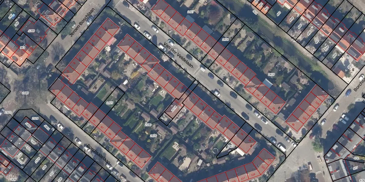 Van der Veldelaan 18 is gelegen op kadastraal perceel HLG03E2416. Deze kadastrale aanduiding is uniek en wordt gebruikt door het Kadaster om eigendomsrechten en andere zakelijke rechten vast te leggen. Het perceel maakt onderdeel uit van de kadastrale gemeente Hillegersberg.