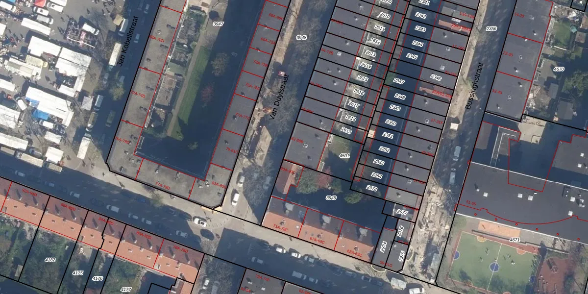 Het perceel waarop Van Duylstraat 84-A staat heeft een oppervlakte van 349 m². Dit is een groot perceel. De perceeloppervlakte wordt geregistreerd door het Kadaster. Gedetailleerde informatie over de maten van dit perceel kunt u vinden in het rapport Kadastrale kaart met maatvoering van Van Duylstraat 84-A.