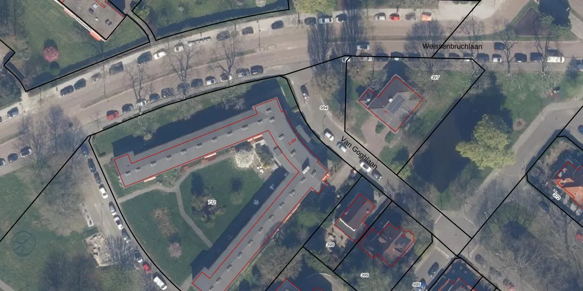 Het perceel waarop Van Goghlaan 2-M staat heeft een oppervlakte van 4641 m². Dit is een zeer groot perceel. De perceeloppervlakte wordt geregistreerd door het Kadaster. Gedetailleerde informatie over de maten van dit perceel kunt u vinden in het rapport Kadastrale kaart met maatvoering van Van Goghlaan 2-M.