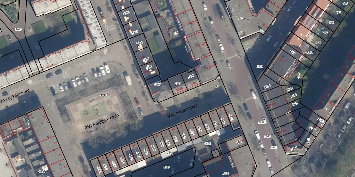 Van Harenstraat 5-B is gelegen op kadastraal perceel RTD10Z1368. Deze kadastrale aanduiding is uniek en wordt gebruikt door het Kadaster om eigendomsrechten en andere zakelijke rechten vast te leggen. Het perceel maakt onderdeel uit van de kadastrale gemeente Rotterdam.