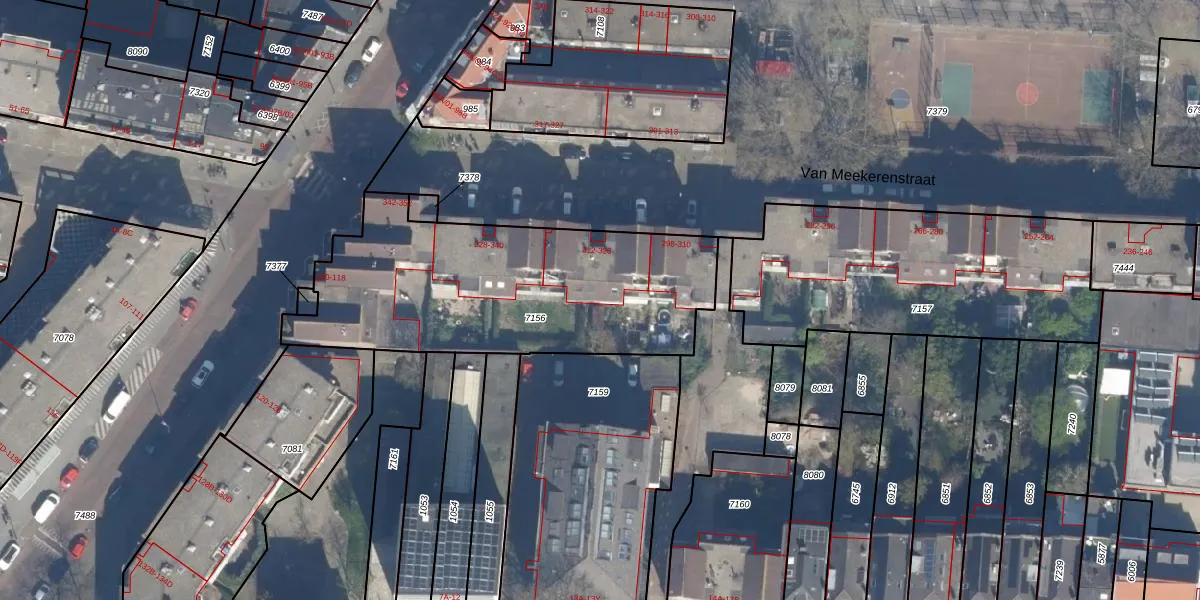Van Meekerenstraat 322 is gelegen op kadastraal perceel RTD07R7156. Deze kadastrale aanduiding is uniek en wordt gebruikt door het Kadaster om eigendomsrechten en andere zakelijke rechten vast te leggen. Het perceel maakt onderdeel uit van de kadastrale gemeente Rotterdam.