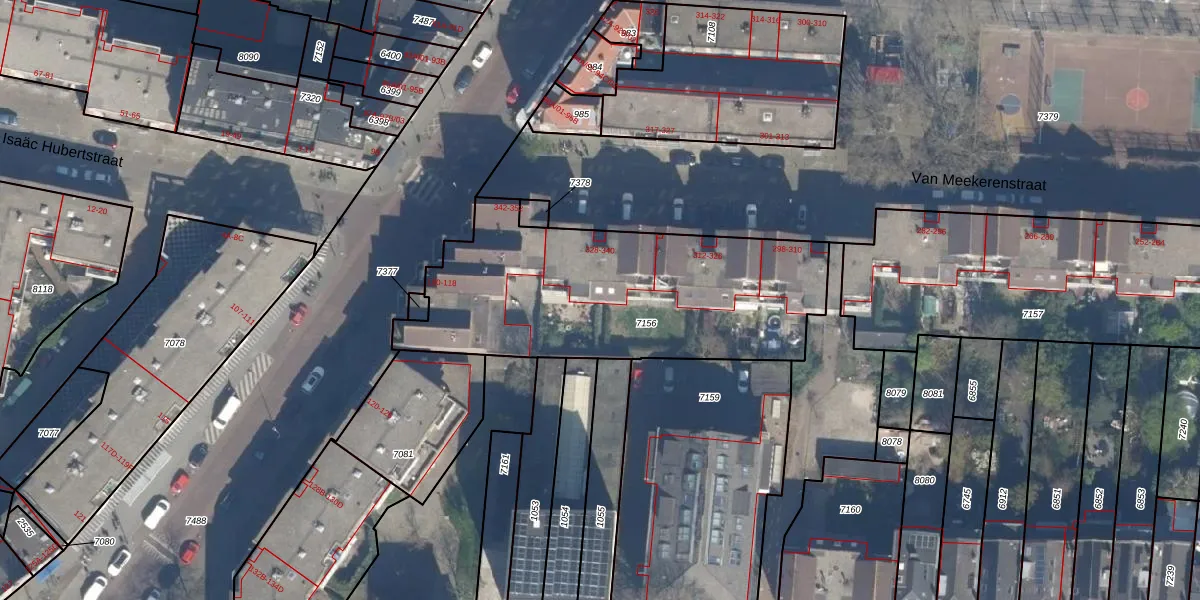 Van Meekerenstraat 340 is gelegen op kadastraal perceel RTD07R7156. Deze kadastrale aanduiding is uniek en wordt gebruikt door het Kadaster om eigendomsrechten en andere zakelijke rechten vast te leggen. Het perceel maakt onderdeel uit van de kadastrale gemeente Rotterdam.