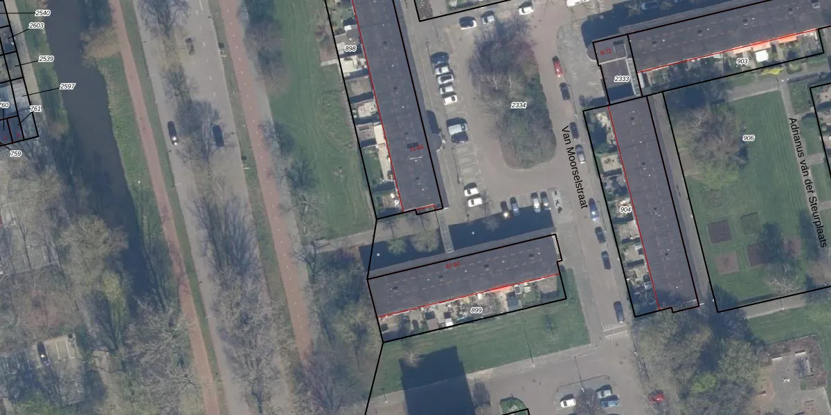 Het perceel waarop Van Moorselstraat 59 staat heeft een oppervlakte van 1175 m². Dit is een zeer groot perceel. De perceeloppervlakte wordt geregistreerd door het Kadaster. Gedetailleerde informatie over de maten van dit perceel kunt u vinden in het rapport Kadastrale kaart met maatvoering van Van Moorselstraat 59.