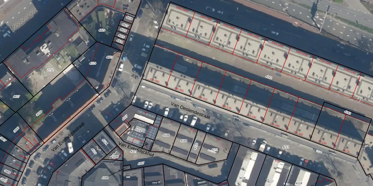 Van Oestendestraat 33-D is gelegen op kadastraal perceel CLS00E4141. Deze kadastrale aanduiding is uniek en wordt gebruikt door het Kadaster om eigendomsrechten en andere zakelijke rechten vast te leggen. Het perceel maakt onderdeel uit van de kadastrale gemeente Charlois.
