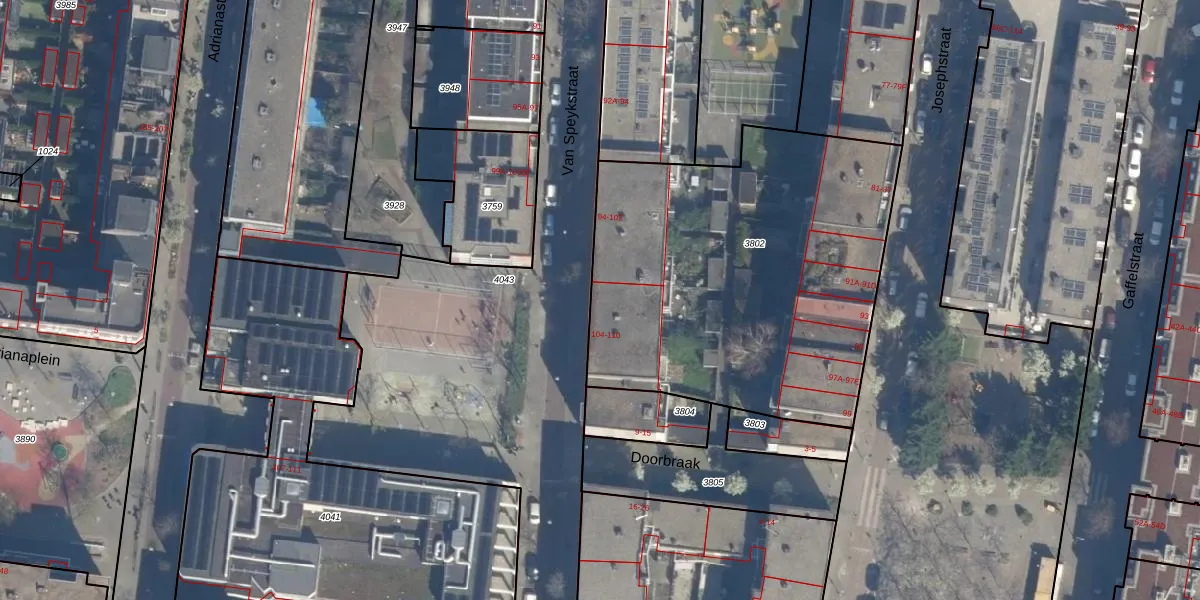 Het perceel waarop Van Speykstraat 104 staat heeft een oppervlakte van 2041 m². Dit is een zeer groot perceel. De perceeloppervlakte wordt geregistreerd door het Kadaster. Gedetailleerde informatie over de maten van dit perceel kunt u vinden in het rapport Kadastrale kaart met maatvoering van Van Speykstraat 104.