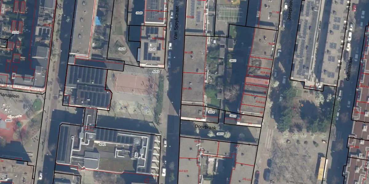 Het perceel waarop Van Speykstraat 110 staat heeft een oppervlakte van 2041 m². Dit is een zeer groot perceel. De perceeloppervlakte wordt geregistreerd door het Kadaster. Gedetailleerde informatie over de maten van dit perceel kunt u vinden in het rapport Kadastrale kaart met maatvoering van Van Speykstraat 110.