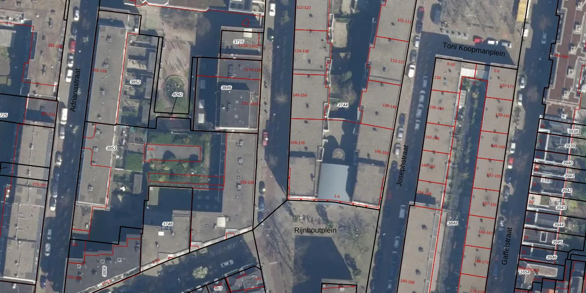 Het perceel waarop het adres ligt is DHV00-D-3744. De afkorting 'DHV00' staat voor kadastrale gemeente Delfshaven. De gemiddelde perceeloppervlakte in de kadastrale gemeente Delfshaven is 628,61 m². Dit perceel is met zijn 3120 m² dus groter dan gemiddeld. Het kleinste perceel in de kadastrale gemeente is 0 m² groot. De grootste perceeloppervlakte is 22,2 ha. Op het perceel liggen in totaal 80 adressen. De huidige grenzen van het perceel zijn digitaal in de Basisregistratie Kadaster (BRK) geregistreerd op 12-03-2003.
