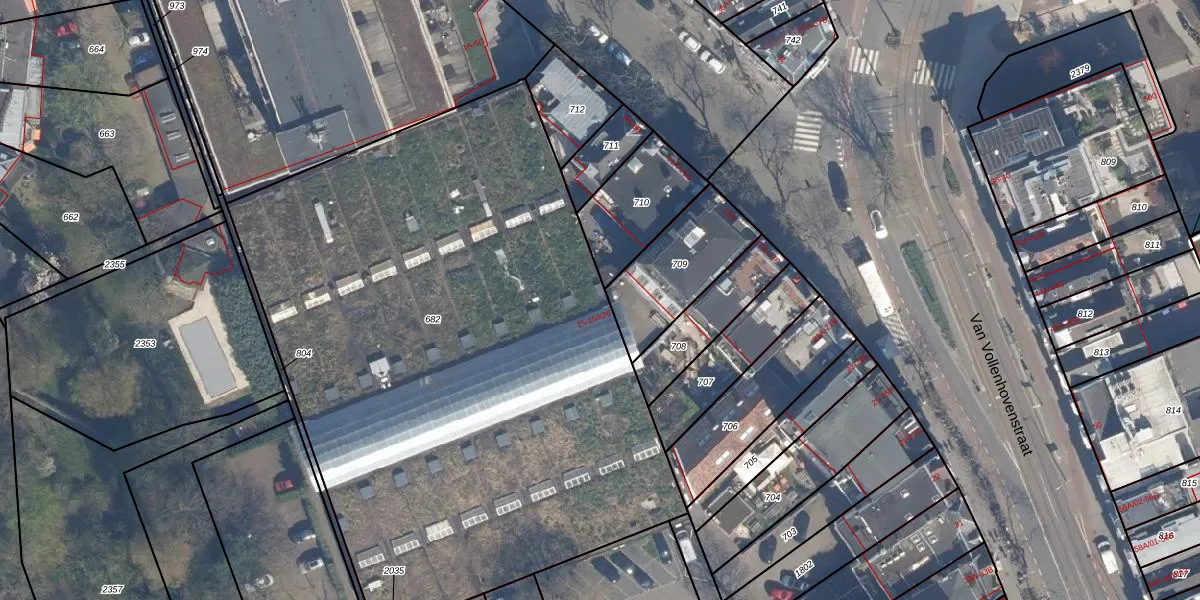 Het perceel waarop Van Vollenhovenstraat 15-K013 staat heeft een oppervlakte van 4102 m². Dit is een zeer groot perceel. De perceeloppervlakte wordt geregistreerd door het Kadaster. Gedetailleerde informatie over de maten van dit perceel kunt u vinden in het rapport Kadastrale kaart met maatvoering van Van Vollenhovenstraat 15-K013.