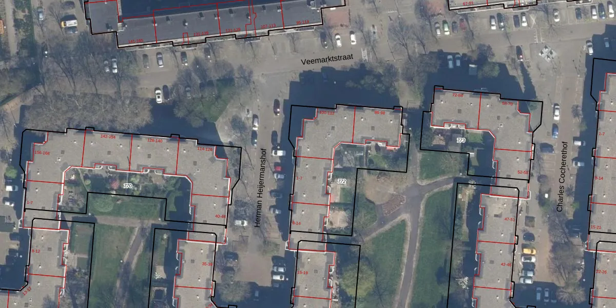 Veemarktstraat 112 is gelegen op kadastraal perceel RTD04AE772. Deze kadastrale aanduiding is uniek en wordt gebruikt door het Kadaster om eigendomsrechten en andere zakelijke rechten vast te leggen. Het perceel maakt onderdeel uit van de kadastrale gemeente Rotterdam.