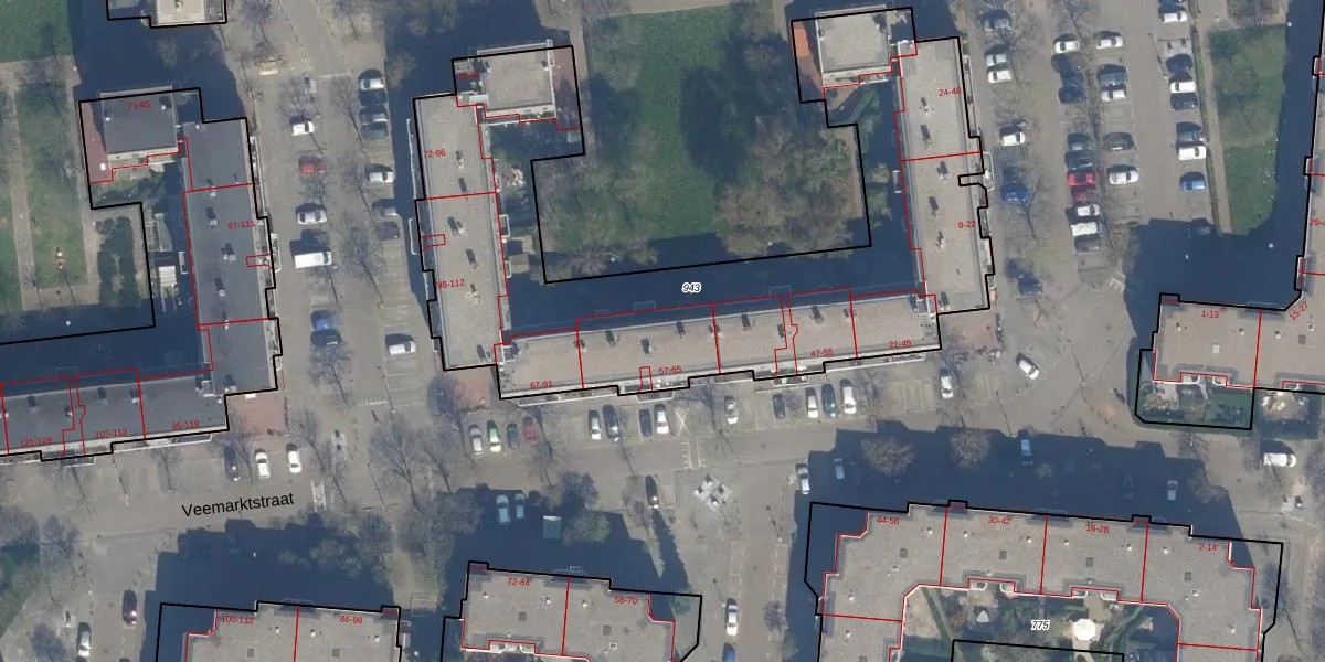 Het perceel waarop Veemarktstraat 61 staat heeft een oppervlakte van 2725 m². Dit is een zeer groot perceel. De perceeloppervlakte wordt geregistreerd door het Kadaster. Gedetailleerde informatie over de maten van dit perceel kunt u vinden in het rapport Kadastrale kaart met maatvoering van Veemarktstraat 61.