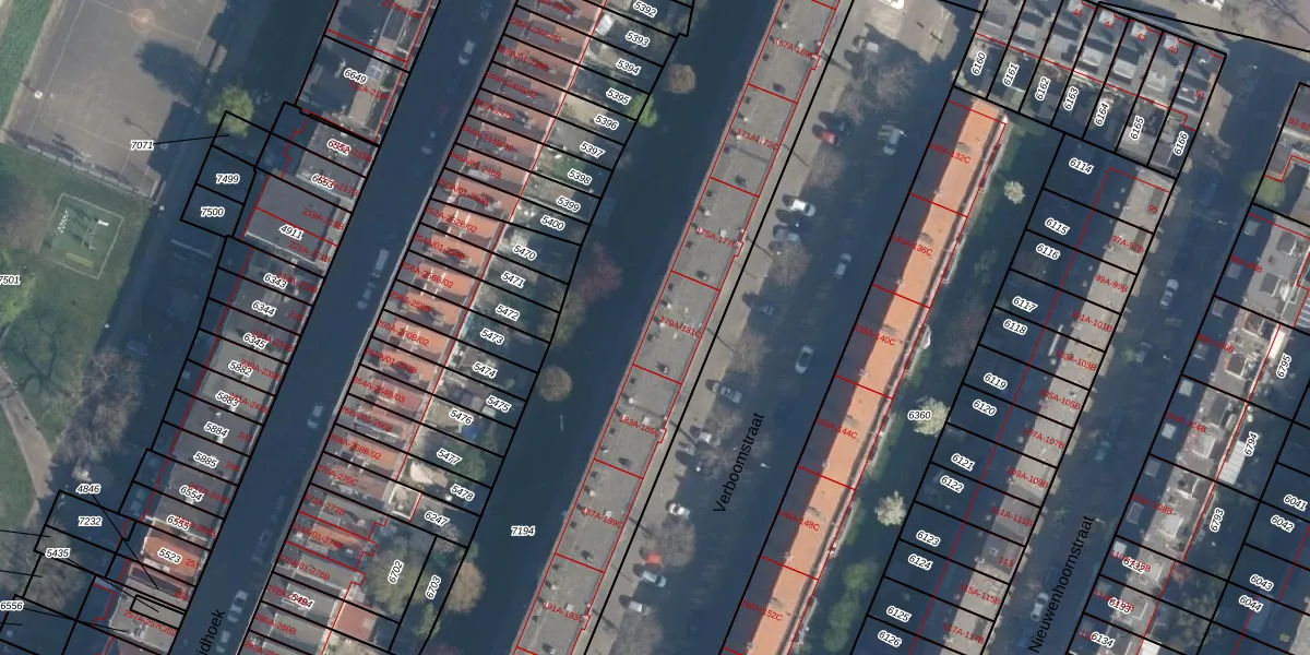 Het perceel waarop Verboomstraat 181-B staat heeft een oppervlakte van 4184 m². Dit is een zeer groot perceel. De perceeloppervlakte wordt geregistreerd door het Kadaster. Gedetailleerde informatie over de maten van dit perceel kunt u vinden in het rapport Kadastrale kaart met maatvoering van Verboomstraat 181-B.