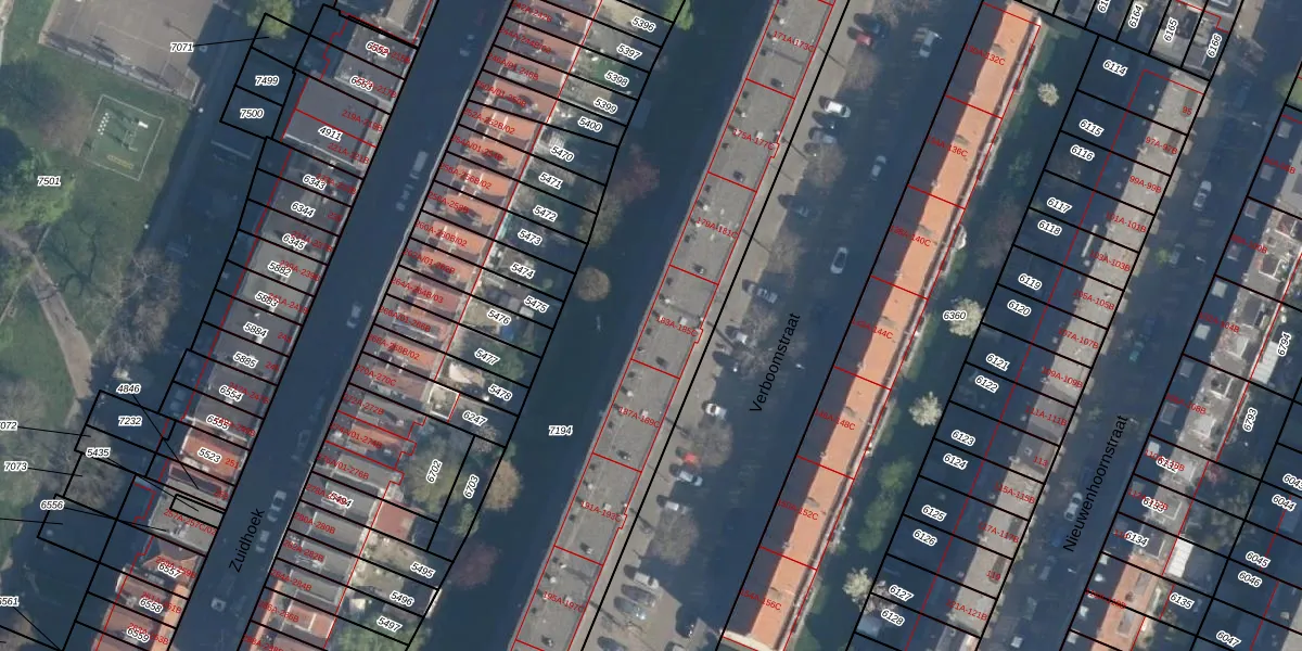 Het perceel waarop Verboomstraat 185-B staat heeft een oppervlakte van 4184 m². Dit is een zeer groot perceel. De perceeloppervlakte wordt geregistreerd door het Kadaster. Gedetailleerde informatie over de maten van dit perceel kunt u vinden in het rapport Kadastrale kaart met maatvoering van Verboomstraat 185-B.
