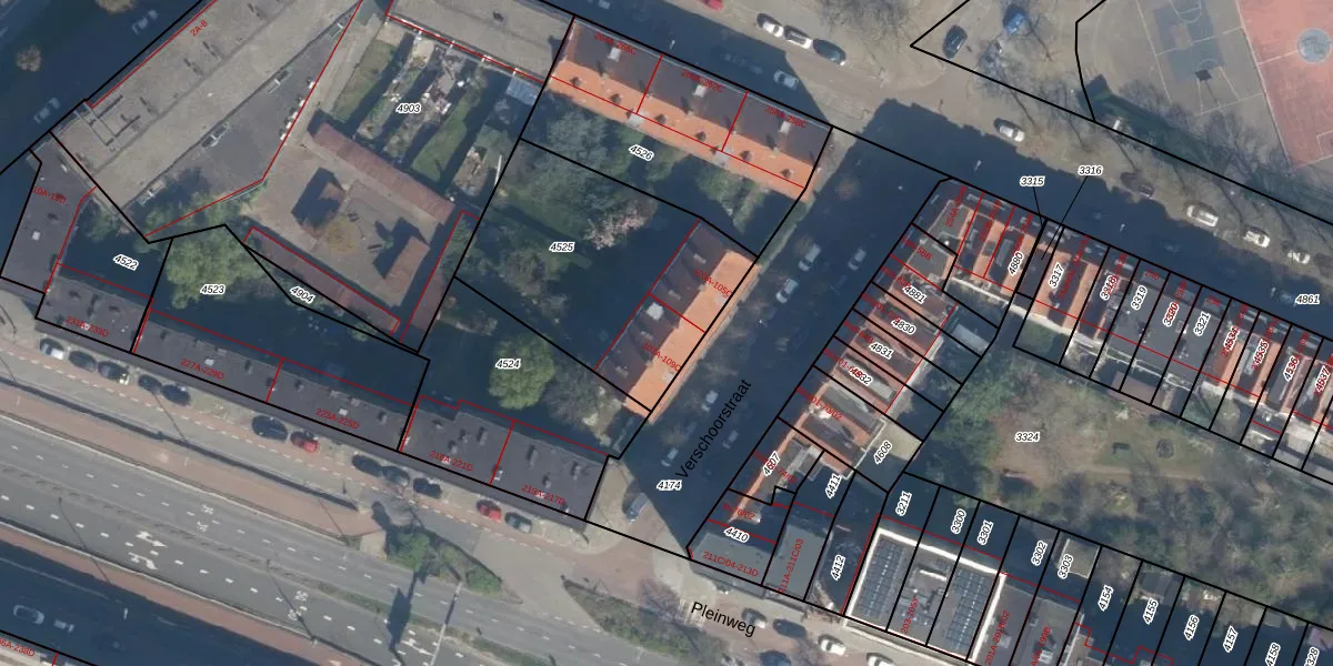 Het perceel waarop Verschoorstraat 107-C staat heeft een oppervlakte van 996 m². Dit is een groot perceel. De perceeloppervlakte wordt geregistreerd door het Kadaster. Gedetailleerde informatie over de maten van dit perceel kunt u vinden in het rapport Kadastrale kaart met maatvoering van Verschoorstraat 107-C.