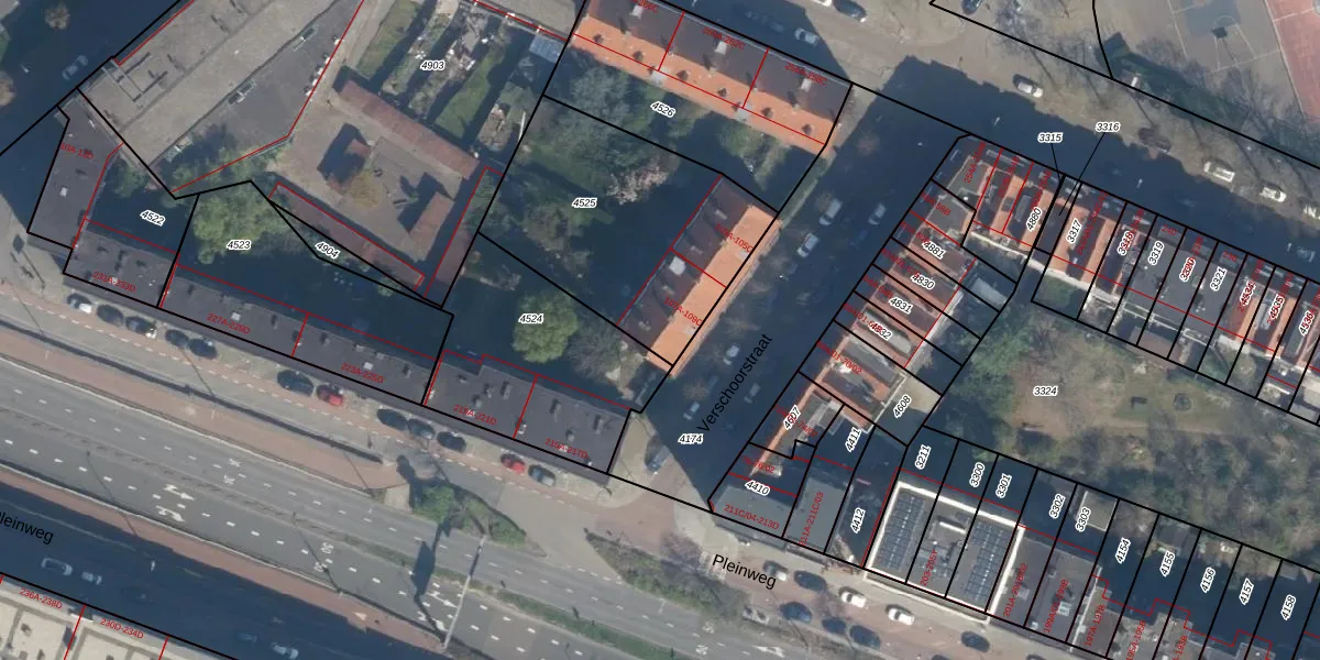 Het perceel waarop Verschoorstraat 109-A staat heeft een oppervlakte van 996 m². Dit is een groot perceel. De perceeloppervlakte wordt geregistreerd door het Kadaster. Gedetailleerde informatie over de maten van dit perceel kunt u vinden in het rapport Kadastrale kaart met maatvoering van Verschoorstraat 109-A.