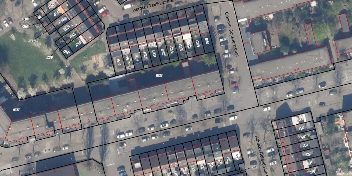 Victor E. van Vrieslandstraat 105 is gelegen op kadastraal perceel RTD13BA1695. Deze kadastrale aanduiding is uniek en wordt gebruikt door het Kadaster om eigendomsrechten en andere zakelijke rechten vast te leggen. Het perceel maakt onderdeel uit van de kadastrale gemeente Rotterdam.