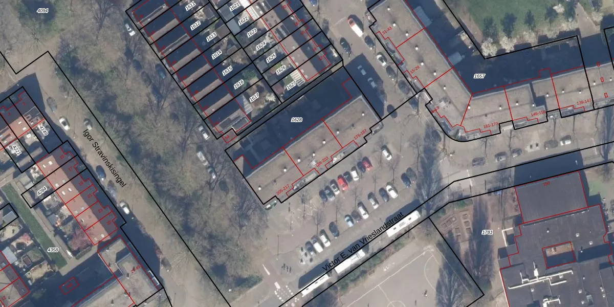 Victor E. van Vrieslandstraat 199 is gelegen op kadastraal perceel RTD13BA1628. Deze kadastrale aanduiding is uniek en wordt gebruikt door het Kadaster om eigendomsrechten en andere zakelijke rechten vast te leggen. Het perceel maakt onderdeel uit van de kadastrale gemeente Rotterdam.
