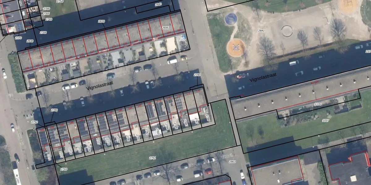 Vignolastraat 172 is gelegen op kadastraal perceel KLG00K2787. Deze kadastrale aanduiding is uniek en wordt gebruikt door het Kadaster om eigendomsrechten en andere zakelijke rechten vast te leggen. Het perceel maakt onderdeel uit van de kadastrale gemeente Kralingen.