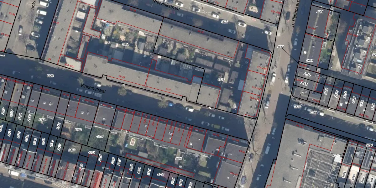 Vinkenstraat 19 is gelegen op kadastraal perceel RTD07W5624. Deze kadastrale aanduiding is uniek en wordt gebruikt door het Kadaster om eigendomsrechten en andere zakelijke rechten vast te leggen. Het perceel maakt onderdeel uit van de kadastrale gemeente Rotterdam.
