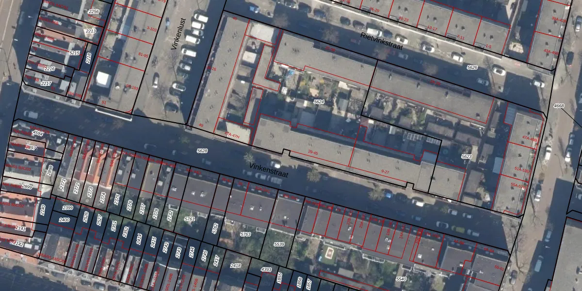 Vinkenstraat 41 is gelegen op kadastraal perceel RTD07W5624. Deze kadastrale aanduiding is uniek en wordt gebruikt door het Kadaster om eigendomsrechten en andere zakelijke rechten vast te leggen. Het perceel maakt onderdeel uit van de kadastrale gemeente Rotterdam.