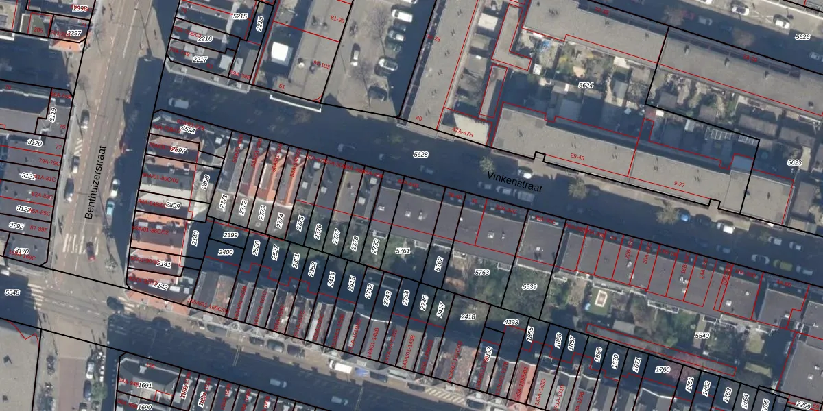 Vinkenstraat 44-B is gelegen op kadastraal perceel RTD07W5761. Deze kadastrale aanduiding is uniek en wordt gebruikt door het Kadaster om eigendomsrechten en andere zakelijke rechten vast te leggen. Het perceel maakt onderdeel uit van de kadastrale gemeente Rotterdam.