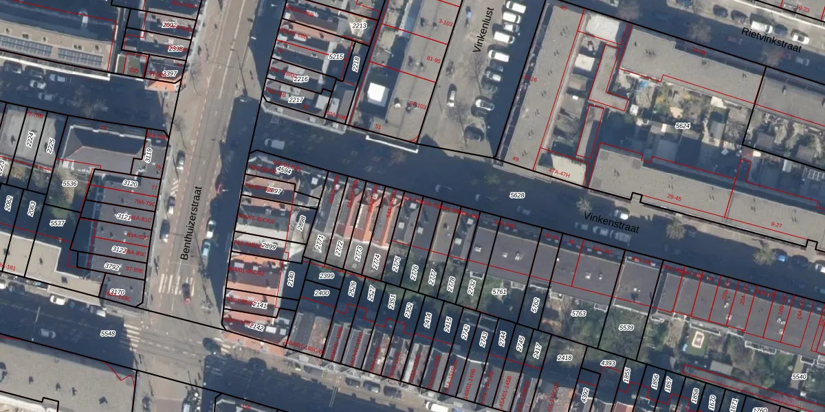 Vinkenstraat 52-B is gelegen op kadastraal perceel RTD07W2775. Deze kadastrale aanduiding is uniek en wordt gebruikt door het Kadaster om eigendomsrechten en andere zakelijke rechten vast te leggen. Het perceel maakt onderdeel uit van de kadastrale gemeente Rotterdam.