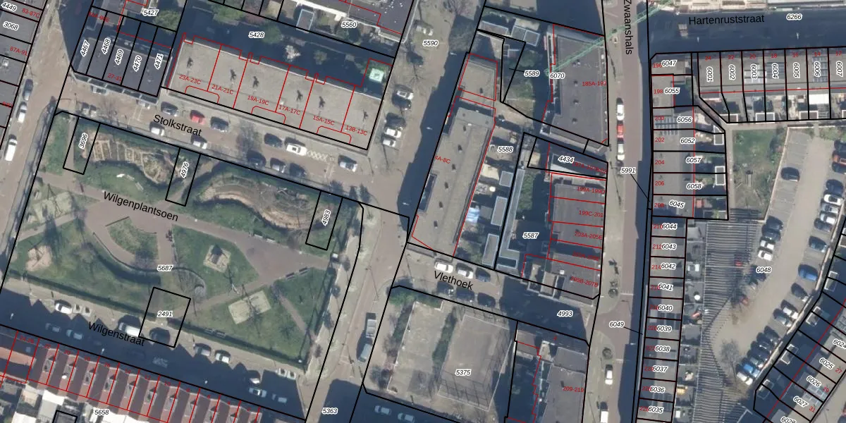 Het adres is gelegen op perceel 5588 in de sectie W en de kadastrale gemeente Rotterdam. De kadastrale aanduiding is aldus RTD07-W-5588. De gemiddelde perceeloppervlakte in de kadastrale gemeente Rotterdam is 506,86 m². Dit perceel is met zijn 975 m² dus groter dan gemiddeld. Het kleinste perceel in de kadastrale gemeente is 0 m² groot. De grootste perceeloppervlakte is 10,8 ha. Er zijn 12 adressen aanwezig op het perceel. De huidige grenzen van het perceel zijn digitaal in de Basisregistratie Kadaster (BRK) geregistreerd op 10-05-2004.