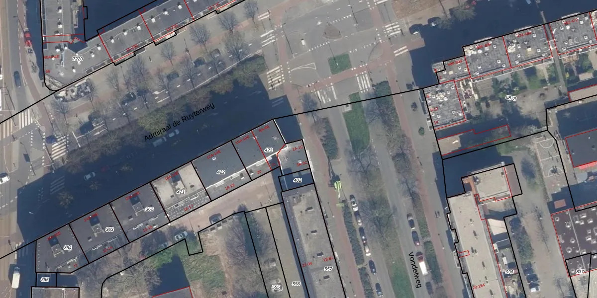 Vondelweg 1-A is gelegen op kadastraal perceel RTD08AD423. Deze kadastrale aanduiding is uniek en wordt gebruikt door het Kadaster om eigendomsrechten en andere zakelijke rechten vast te leggen. Het perceel maakt onderdeel uit van de kadastrale gemeente Rotterdam.