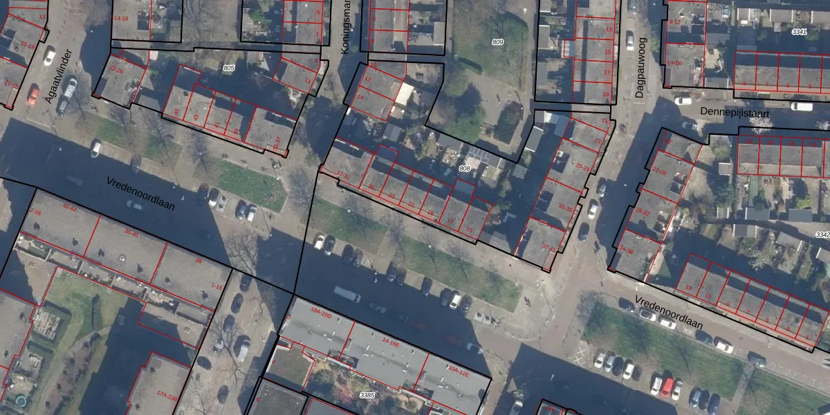 Vredenoordlaan 21 is gelegen op kadastraal perceel RTD04AE808. Deze kadastrale aanduiding is uniek en wordt gebruikt door het Kadaster om eigendomsrechten en andere zakelijke rechten vast te leggen. Het perceel maakt onderdeel uit van de kadastrale gemeente Rotterdam.