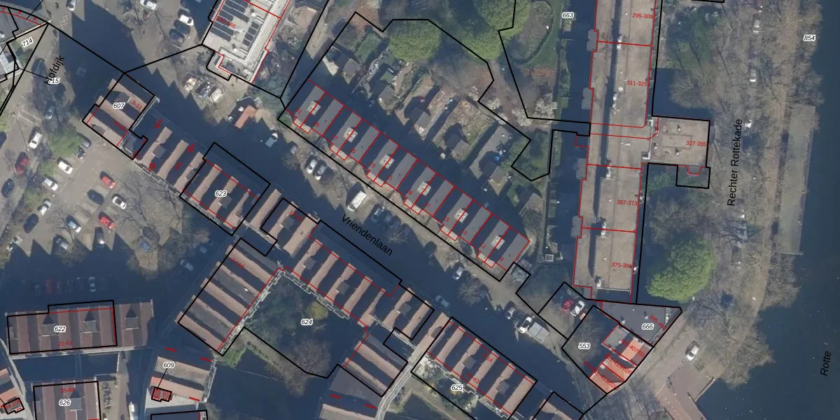 Vriendenlaan 17 is gelegen op kadastraal perceel RTD08AD663. Deze kadastrale aanduiding is uniek en wordt gebruikt door het Kadaster om eigendomsrechten en andere zakelijke rechten vast te leggen. Het perceel maakt onderdeel uit van de kadastrale gemeente Rotterdam.