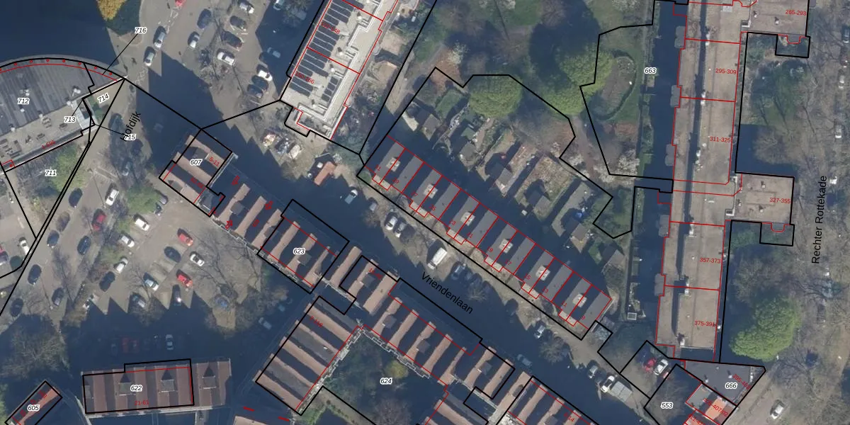 Vriendenlaan 25 is gelegen op kadastraal perceel RTD08AD663. Deze kadastrale aanduiding is uniek en wordt gebruikt door het Kadaster om eigendomsrechten en andere zakelijke rechten vast te leggen. Het perceel maakt onderdeel uit van de kadastrale gemeente Rotterdam.
