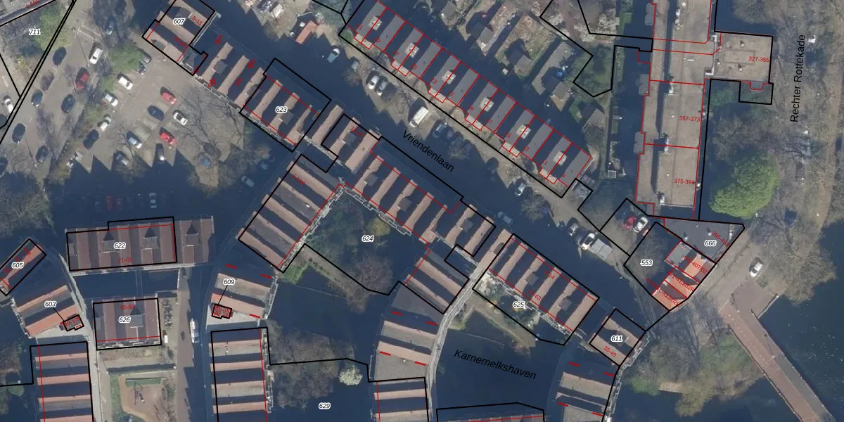 Vriendenlaan 28 is gelegen op kadastraal perceel RTD08AD624. Deze kadastrale aanduiding is uniek en wordt gebruikt door het Kadaster om eigendomsrechten en andere zakelijke rechten vast te leggen. Het perceel maakt onderdeel uit van de kadastrale gemeente Rotterdam.