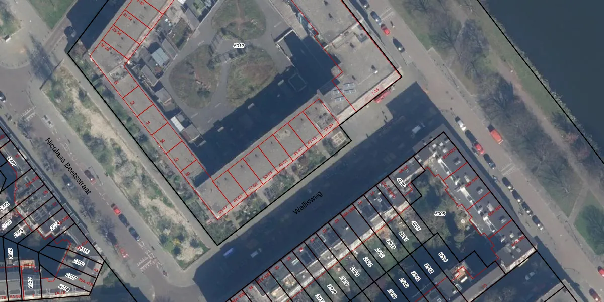 Wallisweg 45 is gelegen op kadastraal perceel RTD10Z5012. Deze kadastrale aanduiding is uniek en wordt gebruikt door het Kadaster om eigendomsrechten en andere zakelijke rechten vast te leggen. Het perceel maakt onderdeel uit van de kadastrale gemeente Rotterdam.