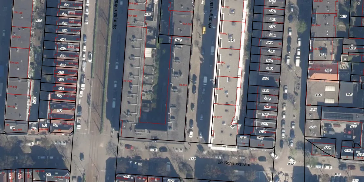 Watergeusstraat 105 is gelegen op kadastraal perceel DHV00A4426. Deze kadastrale aanduiding is uniek en wordt gebruikt door het Kadaster om eigendomsrechten en andere zakelijke rechten vast te leggen. Het perceel maakt onderdeel uit van de kadastrale gemeente Delfshaven.