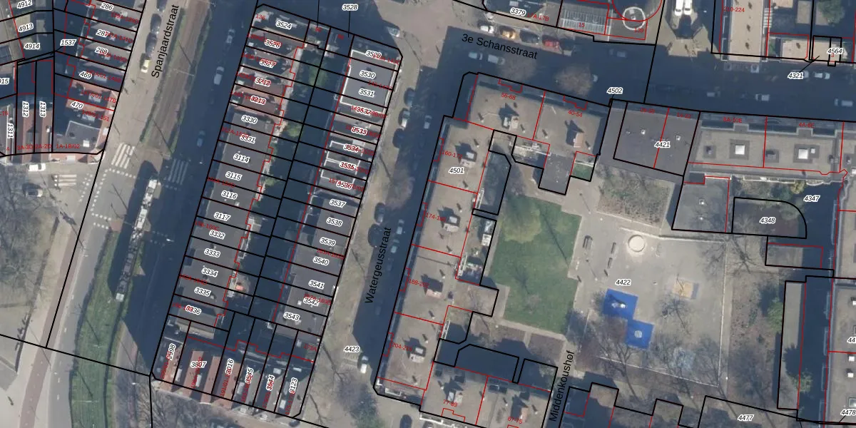 Watergeusstraat 182 is gelegen op kadastraal perceel DHV00A4501. Deze kadastrale aanduiding is uniek en wordt gebruikt door het Kadaster om eigendomsrechten en andere zakelijke rechten vast te leggen. Het perceel maakt onderdeel uit van de kadastrale gemeente Delfshaven.