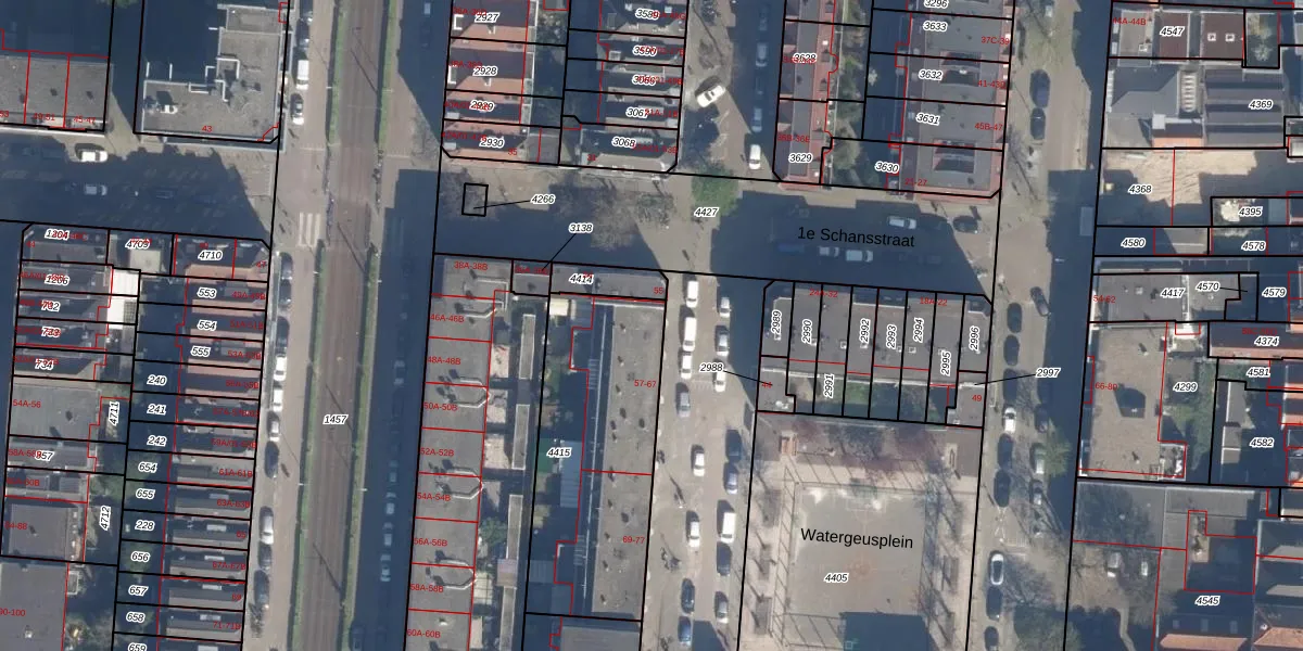 Watergeusstraat 57 is gelegen op kadastraal perceel DHV00A4415. Deze kadastrale aanduiding is uniek en wordt gebruikt door het Kadaster om eigendomsrechten en andere zakelijke rechten vast te leggen. Het perceel maakt onderdeel uit van de kadastrale gemeente Delfshaven.