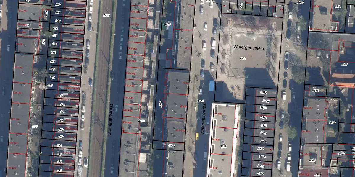 Watergeusstraat 83 is gelegen op kadastraal perceel DHV00A4416. Deze kadastrale aanduiding is uniek en wordt gebruikt door het Kadaster om eigendomsrechten en andere zakelijke rechten vast te leggen. Het perceel maakt onderdeel uit van de kadastrale gemeente Delfshaven.