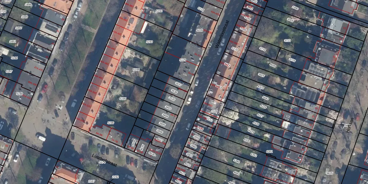 Het perceel waarop Waterloostraat 65-E staat heeft een oppervlakte van 91 m². Dit is een klein perceel. De perceeloppervlakte wordt geregistreerd door het Kadaster. Gedetailleerde informatie over de maten van dit perceel kunt u vinden in het rapport Kadastrale kaart met maatvoering van Waterloostraat 65-E.