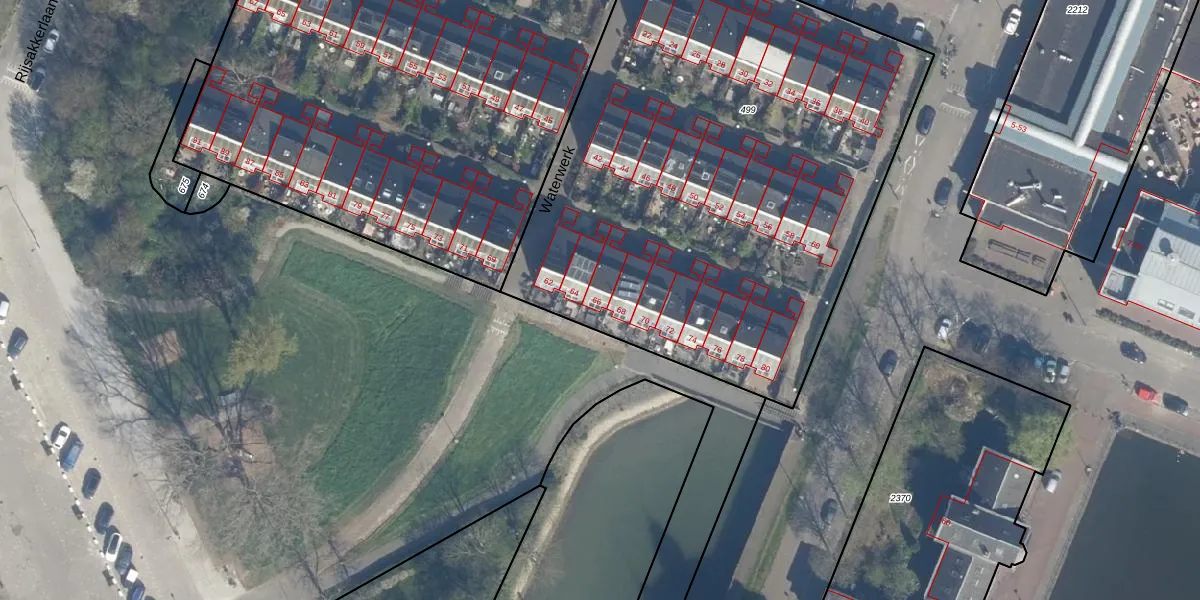 Het perceel waarop Waterwerk 66 staat heeft een oppervlakte van 3338 m². Dit is een zeer groot perceel. De perceeloppervlakte wordt geregistreerd door het Kadaster. Gedetailleerde informatie over de maten van dit perceel kunt u vinden in het rapport Kadastrale kaart met maatvoering van Waterwerk 66.