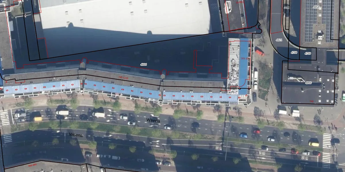 Het perceel waarop Weena 913 staat heeft een oppervlakte van 4211 m². Dit is een zeer groot perceel. De perceeloppervlakte wordt geregistreerd door het Kadaster. Gedetailleerde informatie over de maten van dit perceel kunt u vinden in het rapport Kadastrale kaart met maatvoering van Weena 913.