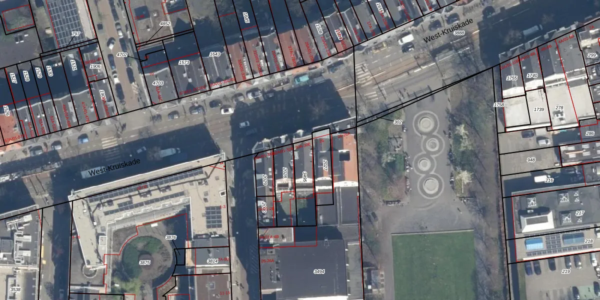 West-Kruiskade 30-A is gelegen op kadastraal perceel DHV00D3495. Deze kadastrale aanduiding is uniek en wordt gebruikt door het Kadaster om eigendomsrechten en andere zakelijke rechten vast te leggen. Het perceel maakt onderdeel uit van de kadastrale gemeente Delfshaven.