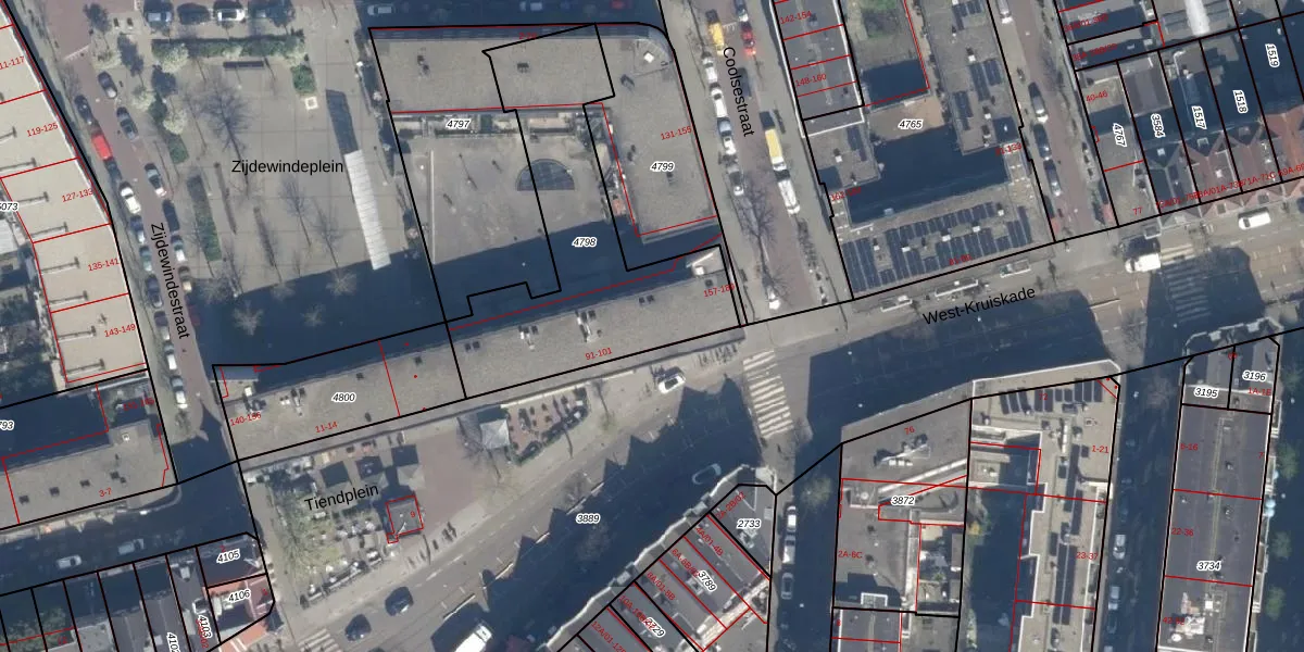 Het perceel waarop West-Kruiskade 93 staat heeft een oppervlakte van 1063 m². Dit is een zeer groot perceel. De perceeloppervlakte wordt geregistreerd door het Kadaster. Gedetailleerde informatie over de maten van dit perceel kunt u vinden in het rapport Kadastrale kaart met maatvoering van West-Kruiskade 93.