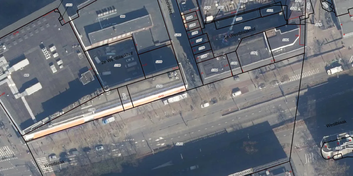 Het perceel waarop Westblaak 19 staat heeft een oppervlakte van 413 m². Dit is een groot perceel. De perceeloppervlakte wordt geregistreerd door het Kadaster. Gedetailleerde informatie over de maten van dit perceel kunt u vinden in het rapport Kadastrale kaart met maatvoering van Westblaak 19.