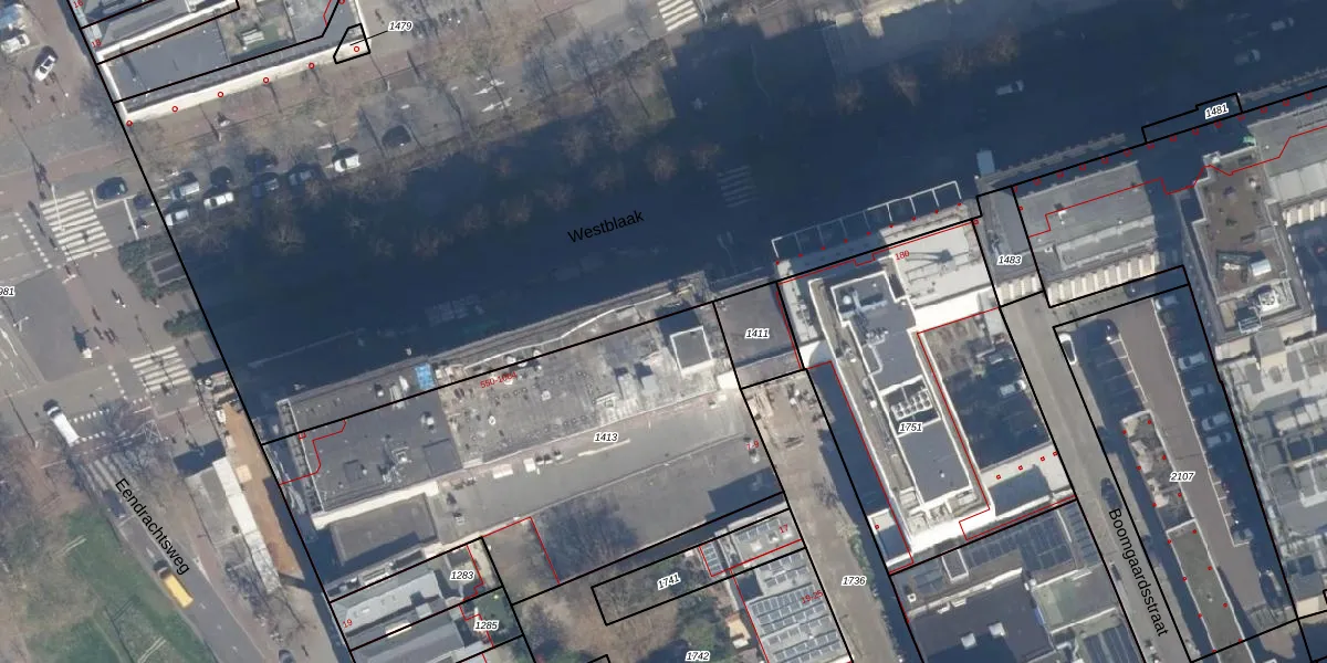 Het perceel waarop Westblaak 762 staat heeft een oppervlakte van 2099 m². Dit is een zeer groot perceel. De perceeloppervlakte wordt geregistreerd door het Kadaster. Gedetailleerde informatie over de maten van dit perceel kunt u vinden in het rapport Kadastrale kaart met maatvoering van Westblaak 762.