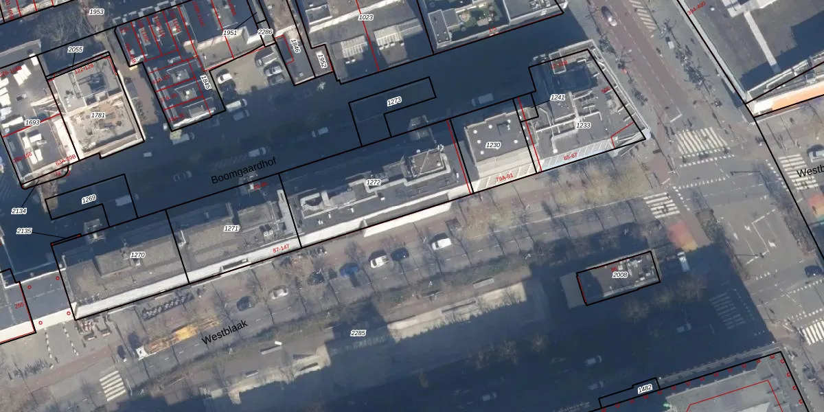 Het perceel waarop Westblaak 97 staat heeft een oppervlakte van 828 m². Dit is een groot perceel. De perceeloppervlakte wordt geregistreerd door het Kadaster. Gedetailleerde informatie over de maten van dit perceel kunt u vinden in het rapport Kadastrale kaart met maatvoering van Westblaak 97.