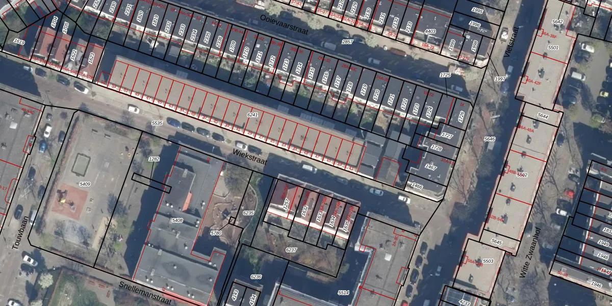 Wiekstraat 19 is gelegen op kadastraal perceel RTD07W6241. Deze kadastrale aanduiding is uniek en wordt gebruikt door het Kadaster om eigendomsrechten en andere zakelijke rechten vast te leggen. Het perceel maakt onderdeel uit van de kadastrale gemeente Rotterdam.