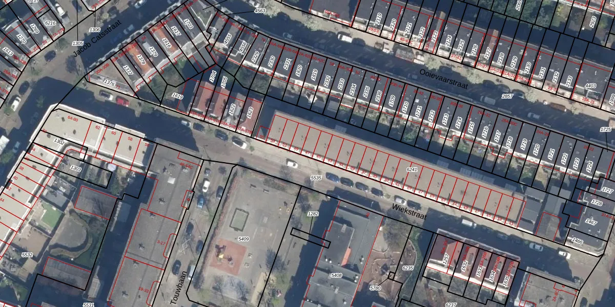 Wiekstraat 47 is gelegen op kadastraal perceel RTD07W6241. Deze kadastrale aanduiding is uniek en wordt gebruikt door het Kadaster om eigendomsrechten en andere zakelijke rechten vast te leggen. Het perceel maakt onderdeel uit van de kadastrale gemeente Rotterdam.