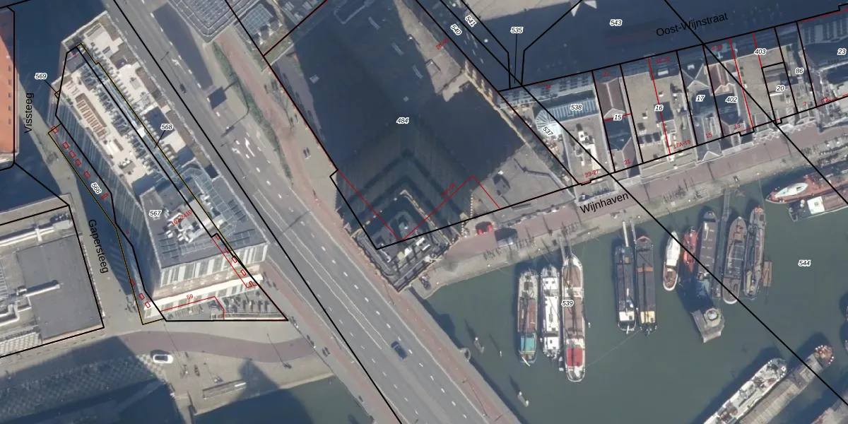Het perceel waarop Wijnhaven 41-E staat heeft een oppervlakte van 2554 m². Dit is een zeer groot perceel. De perceeloppervlakte wordt geregistreerd door het Kadaster. Gedetailleerde informatie over de maten van dit perceel kunt u vinden in het rapport Kadastrale kaart met maatvoering van Wijnhaven 41-E.