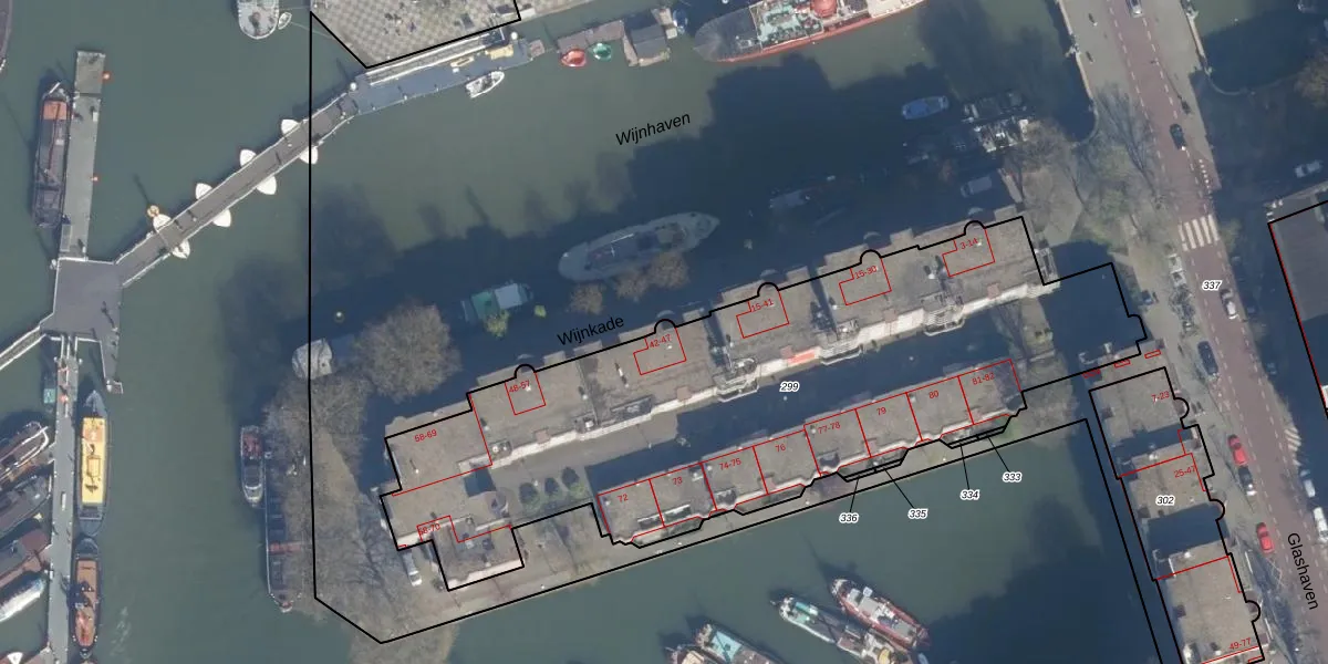 Het perceel waarop Wijnkade 43 staat heeft een oppervlakte van 2981 m². Dit is een zeer groot perceel. De perceeloppervlakte wordt geregistreerd door het Kadaster. Gedetailleerde informatie over de maten van dit perceel kunt u vinden in het rapport Kadastrale kaart met maatvoering van Wijnkade 43.