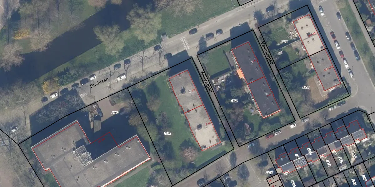 Het perceel waarop Willaertpad 2 staat heeft een oppervlakte van 2114 m². Dit is een zeer groot perceel. De perceeloppervlakte wordt geregistreerd door het Kadaster. Gedetailleerde informatie over de maten van dit perceel kunt u vinden in het rapport Kadastrale kaart met maatvoering van Willaertpad 2.