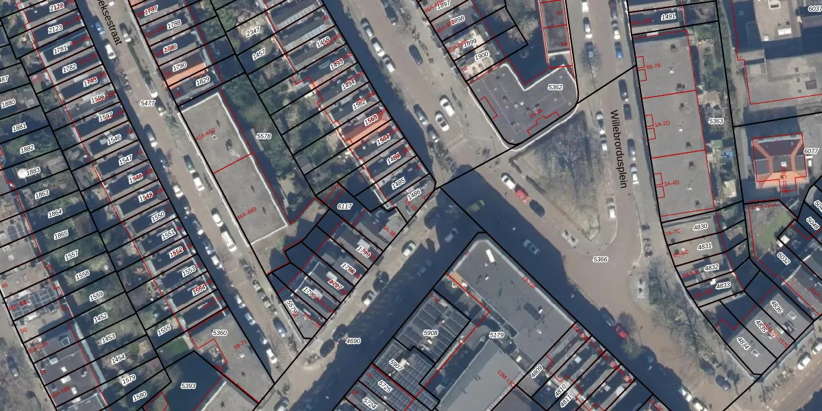 Het perceel waarop Willebrordusstraat 1-B staat heeft een oppervlakte van 62 m². Dit is een klein perceel. De perceeloppervlakte wordt geregistreerd door het Kadaster. Gedetailleerde informatie over de maten van dit perceel kunt u vinden in het rapport Kadastrale kaart met maatvoering van Willebrordusstraat 1-B.